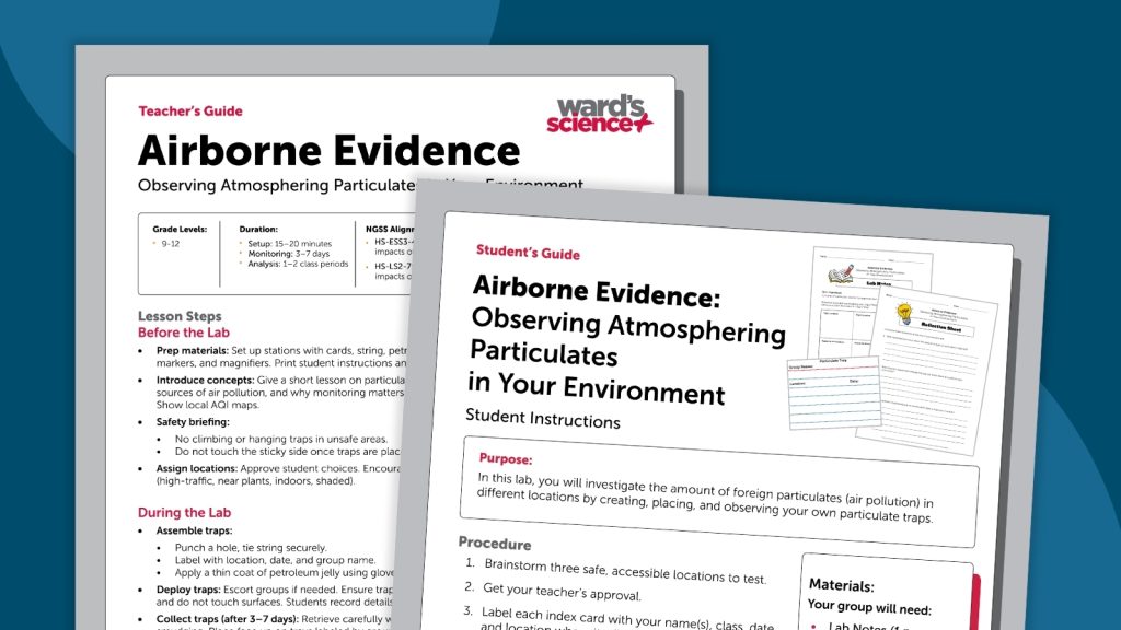 Air pollution is often invisible to the naked eye, but this memorable experiment makes it impossible to ignore. In this free, ready‑to‑use lesson plan from Ward’s Science, your students create petroleum‑jelly–coated index card particulate traps. After hanging them in various locations, they return later to observe the dust, fibers, soot, pollen, and other airborne evidence they’ve collected.
